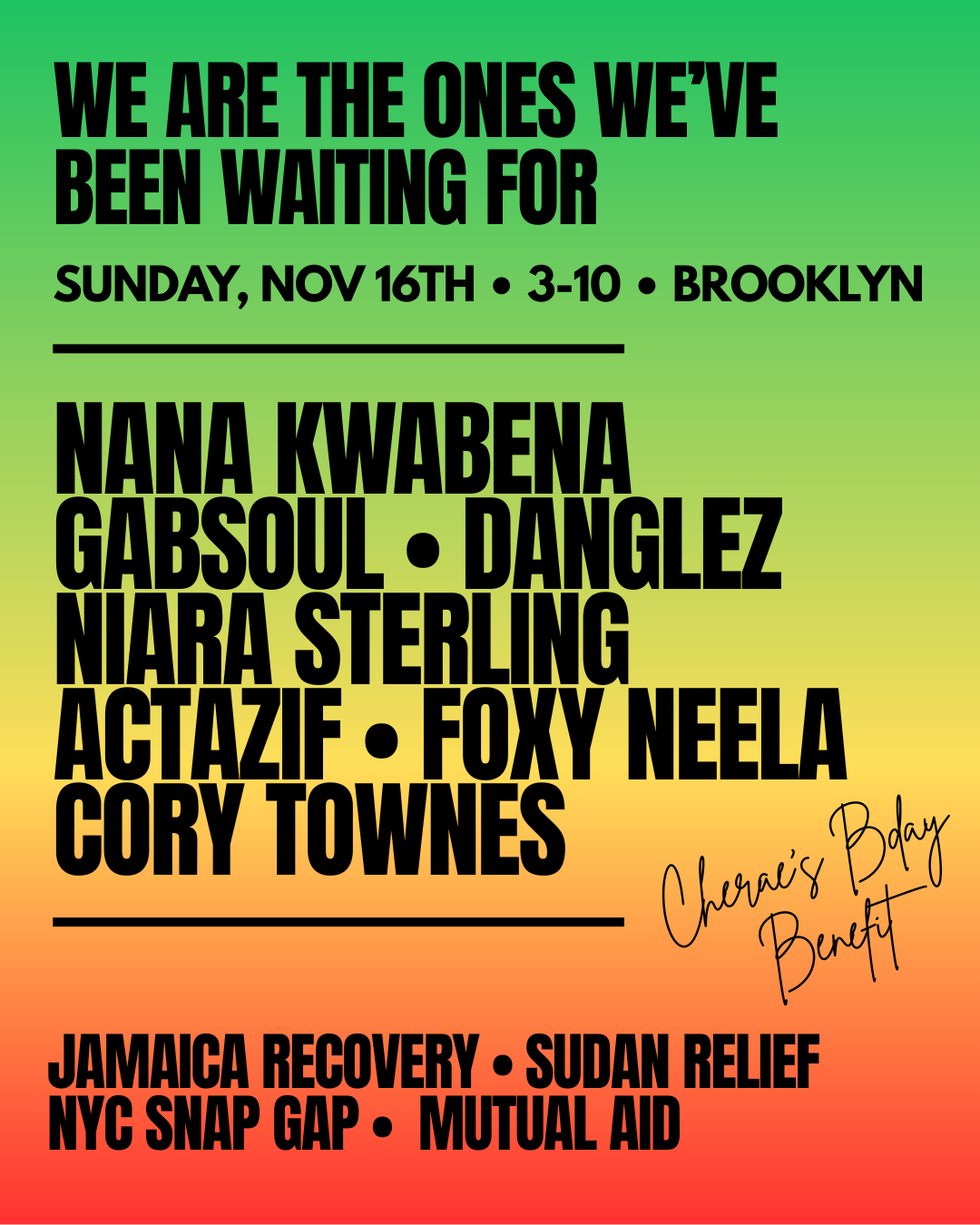 On Sunday, Nov 16th, some of my absolute FAVORITE DJ's are donating their time and talent so we can lend our support to causes that require our urgent attention: rebuilding Jamaica after Hurricane Melissa, the ongoing crisis in Sudan, and families here in NYC dealing with the loss of SNAP benefits.